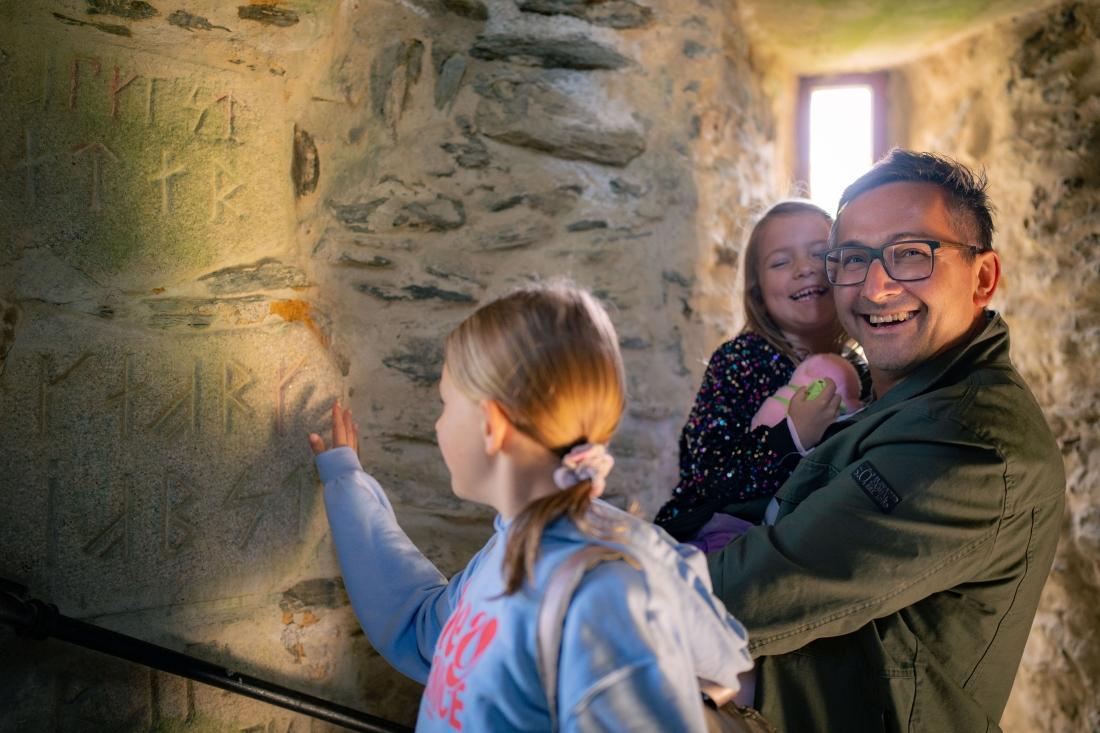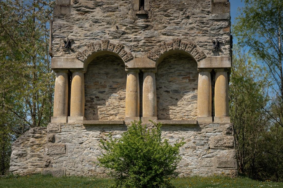 Masivní pylon z místní břidlice se zvedá ze čtvercové základny. Fasáda je zdobena arkádami a pilíři, ve vyšších patrech se nachází balkóny a ochozy. Uvnitř vede točité žulové schodiště se 65 schody, stěny jsou osazeny kamennými deskami s věnováními. Věž nese množství mytologických a náboženských symbolů a tvoří archetypální dominantu Zelené hory.